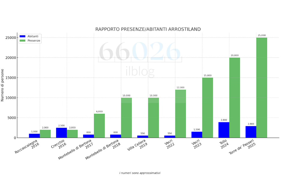 Ma è anche una sfida organizzativa. L’ultima edizione a Torre de’ Passeri ha richiesto navette dedicate, treni potenziati, aree parcheggio esterne e un piano di sicurezza rigoroso. Per Ortona, dove ci si aspetterebbero numeri almeno doppi rispetto al record delle 25mila presenze dell’ultima edizione, significherebbe gestire decine migliaia di persone in più rispetto a qualsiasi manifestazione recente (comparabile soltanto all’attracco dell’Amerigo Vespucci e al Giro d’Italia), con tutto ciò che comporta in termini di traffico, ordine pubblico, servizi igienici e pulizia. Una sfida nella sfida sia per Ortona che per Arrostiland stessa, considerando soprattutto che finora il comune più grande in termini di abitanti ad ospitare la manifestazione è stato Tollo, con meno di 4mila residenti.