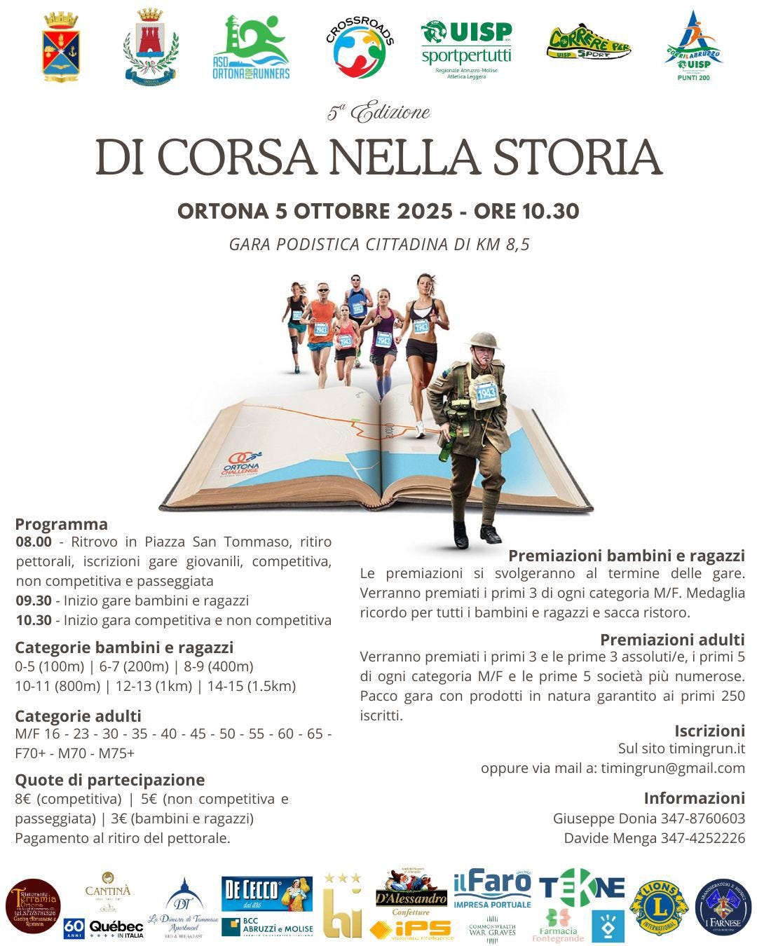 “Di corsa nella storia”, il 5 ottobre la quinta edizione. Torna la corsa podistica tra le vie del centro storico. Domenica 5 ottobre, alle 10.30, inizierà la stracittadina di 8,5 km che abbina sport e valorizzazione dei luoghi simbolo della città legati alla Battaglia di Ortona.