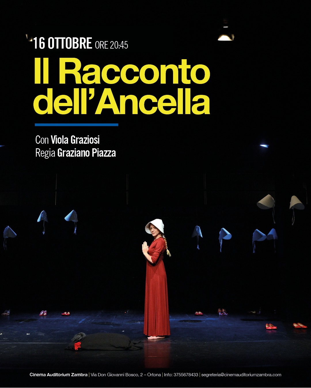 La nuova stagione del teatro Zambra si aprirà il 16 ottobre alle 20:45 con Il racconto dell’ancella, interpretato da Viola Graziosi e diretto da Graziano Piazza. Seguiranno: Stand up opera (12 novembre), Stabat Mater con Fabrizia Sacchi per la regia di Luca Guadagnino (12 dicembre), Birre e rivelazioni con Andrea Renzi e Tony Laudadio (22 gennaio), L’ultima corsa di Fred su Fred Buscaglione (19 marzo) e Mare di ruggine (8 aprile).