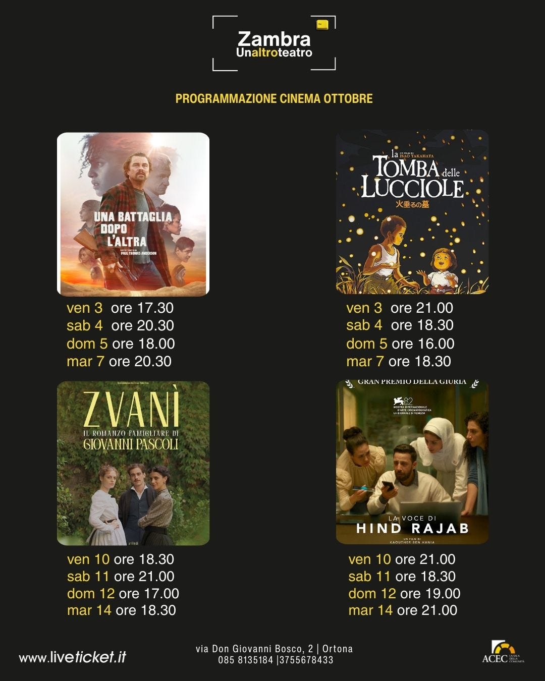 • Cinema Zambra (ottobre): “Una battaglia dopo l’altra”, “La tomba delle lucciole”, “Zvanì”, “La voce di Hind Rajab”.